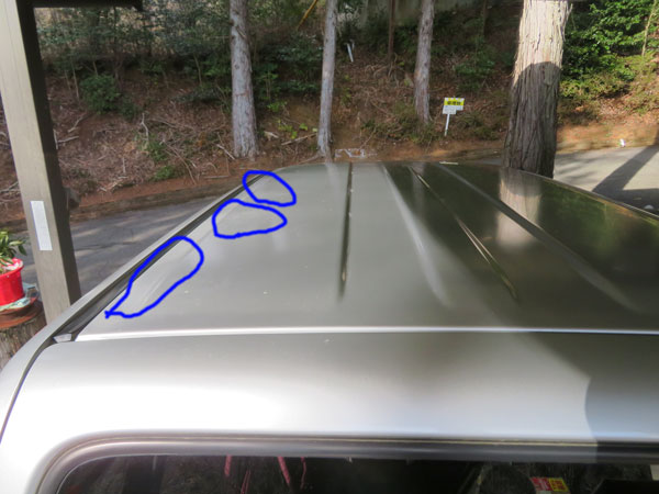 写真では分かりにくいが、屋根には艶のなくなったところ(青丸、その他)がある。