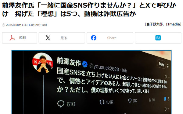 収益を上げなければ成り立たないわけだから、前澤氏も「やっぱり詐欺広告やるね」と言い出すかも知れない。