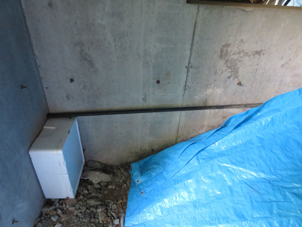 発泡スチロールの箱を置いて高さを見ているが、だいたいこの箱の高さ位の所に板を張れば水平になる。