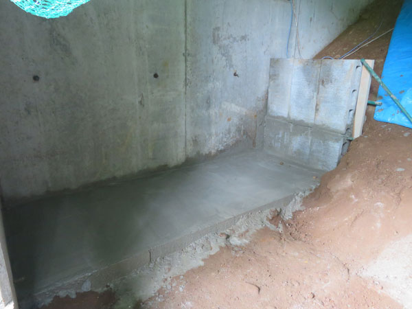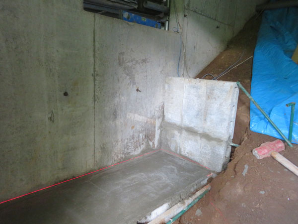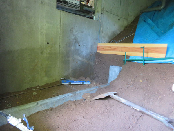 下の写真の斜めの棒は、コンクリートが固まるまでブロックを壁の方に押さえつけているものだ。