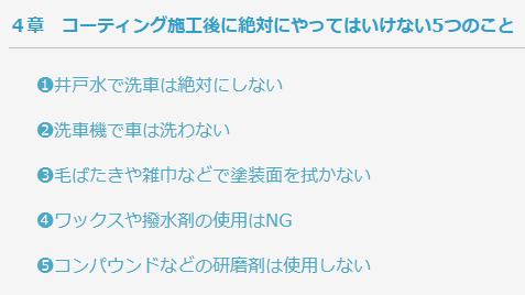 ガラスコーティングをしたら、以下の事は禁止だそうだ。