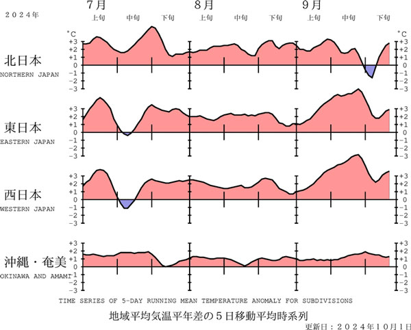 ゼロ点が平年値なので、平均よりも気温の高い日が多かったことが分かる。