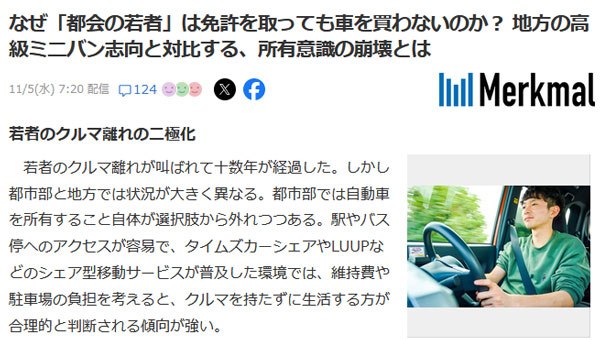 生活に車が必須な地方では従来と変わらず、都市部ではもはや車は必要がなく、その中間地域では記事のように趣味や見栄としての車の存在がある。