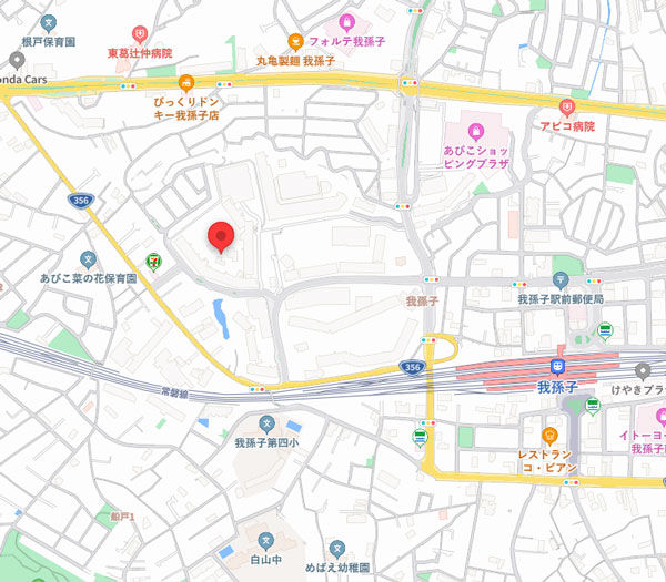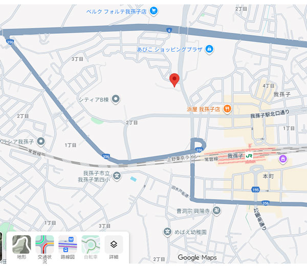 住所は千葉県 我孫子市 我孫子2-5-XXXで、GoogleMapでは以下のように表示される。