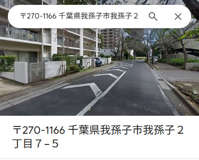 左側の検索窓を見ると、千葉県 我孫子市 我孫子2-7-5が表示されている。