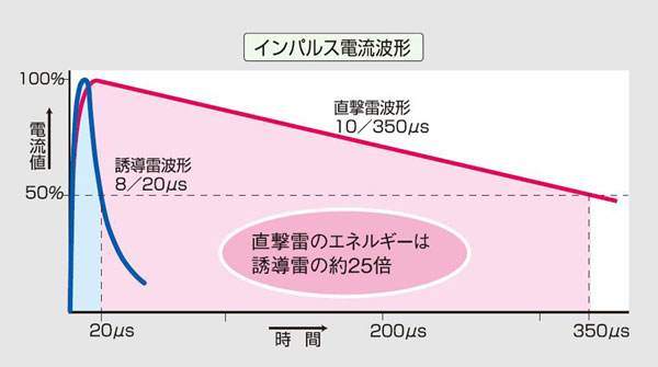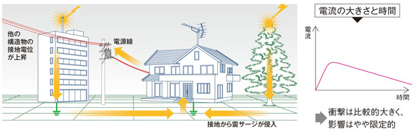 例えば電柱に落雷した場合には電柱のアース線に雷電流が流れる。