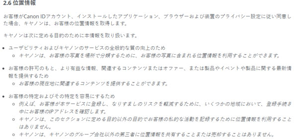 日本人向けの規約では「プライバシー設定に従い同意した場合、キヤノンは、お客様の位置情報を取得します。」となっていて、サービスを使用するには位置情報提供が必要だとなる。