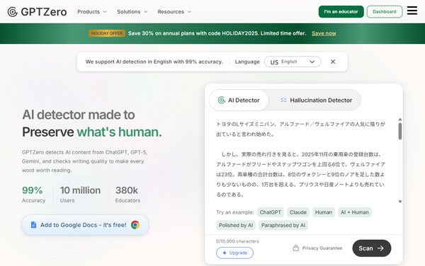 「AIによる生成文章の見分け方」に関する需要が高まる中、多くの無料ツールが提供されています。その中でも特に「GPTZero」はユーザーに人気があります。GPTZeroは無料プランで月間10,000ワードまでスキャン可能で、簡単な登録操作で利用を開始できる点が魅力です。また、複数の言語に対応しており、初心者にとっても利用しやすいデザインが特徴です。こういったツールを利用することで、手軽にAI生成文章を判別することが可能になります。