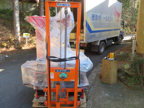 トラックから降ろせるか?運べるのかが最も心配だったのだが、ハンドリフトがあれば特に難しい事はなかった。