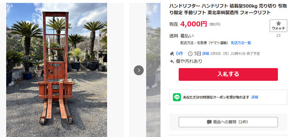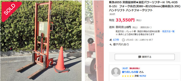 下の出品物は油圧タイプのハンドリフトで、結構良いお値段である。
