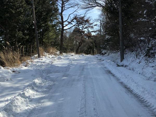 山道は除雪されていたのだが、除雪で残った雪が凍ったようになっている。