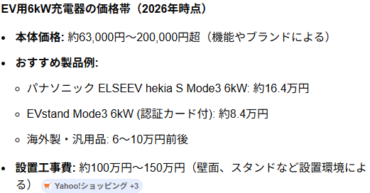 従量電灯Cと6kW充電器の工事で100万円~150万円かかると以下にはある。
