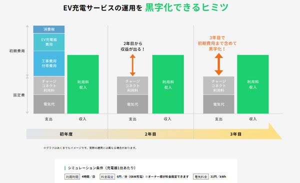 70円/kWhで仕入れた電力(31円/kWh+フランチャイズ料)を600円/kWhで販売すると、3年目に黒字化出来るという図だ。