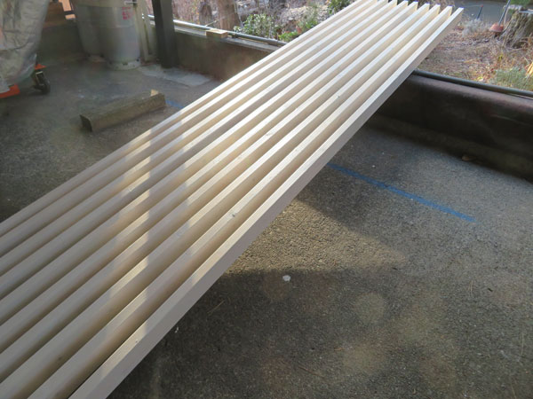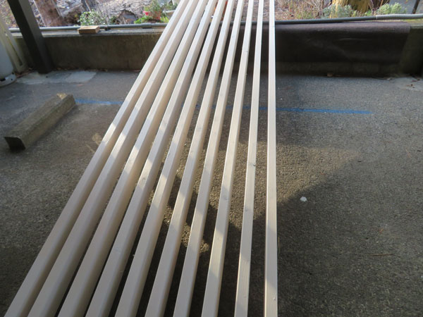 3月だというのに冷たい風の吹く中、ペンキを塗りおえた2×4材が夕日に照らされている。