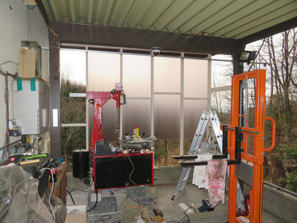 内側から嵌め込むにはタイヤチェンジャーをいったんどかす必要があるので、南側の地面に降ろしてから引き上げた。