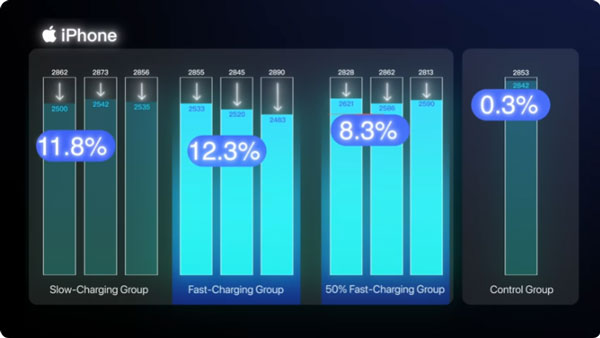 普通充電では11.8%の劣化、急速充電では12.3%の劣化、30%-80%使用では8.3%の劣化だ。