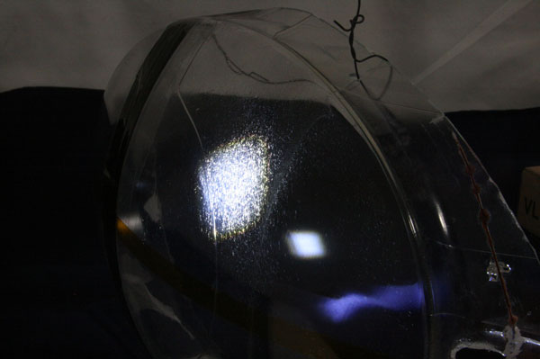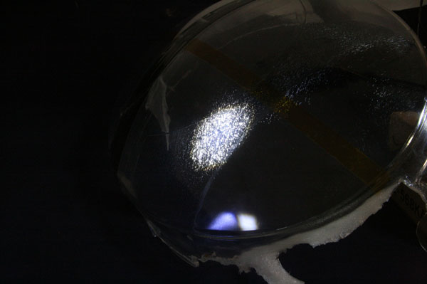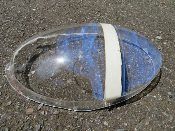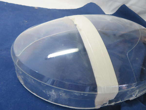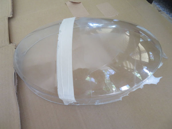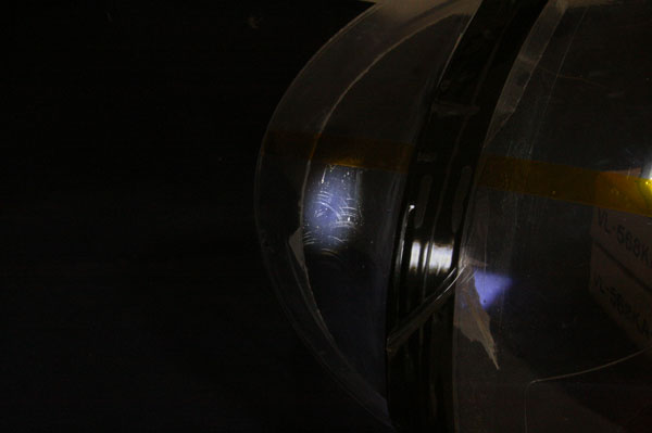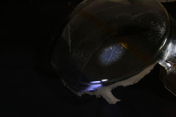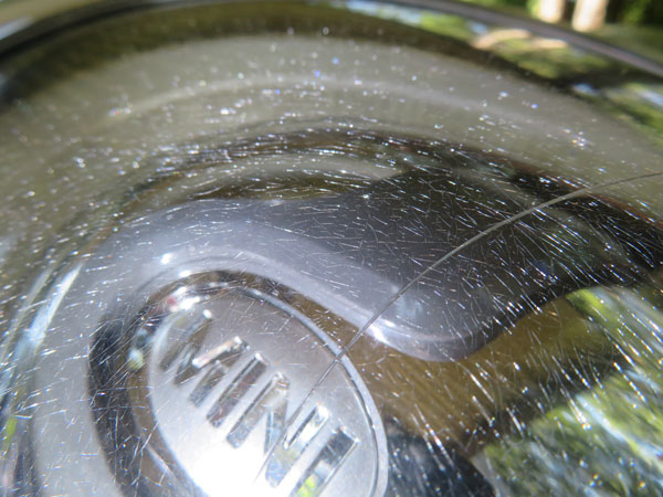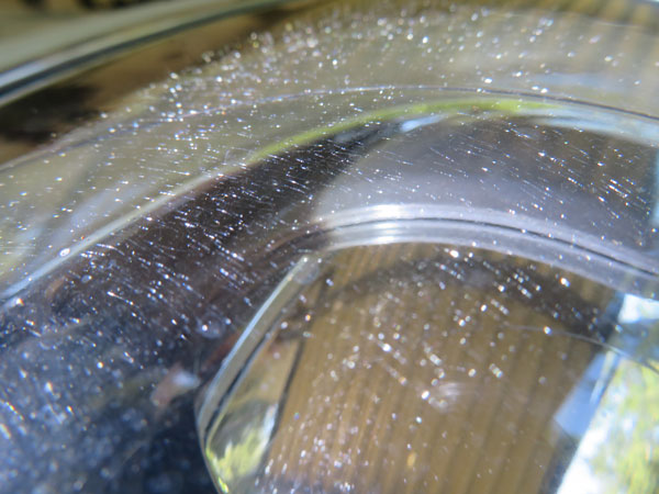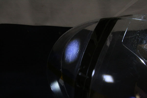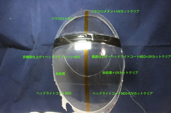 実験用のヘッドライトカバーは、写真左の透明度の高い所がジクロロメタンで処理したもの、中央付近の弧を描いている所が目の異なるサンドペーパで仕上げた部分、左端は通常の研磨を行った部分、そしてその間は未処理の部分が残してある。