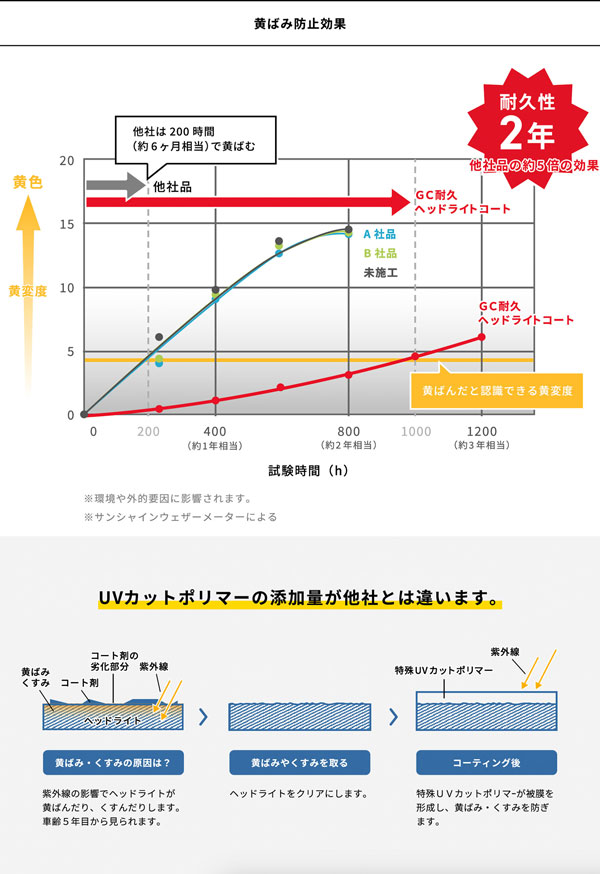 ヘッドライトコートNEOの紫外線透過率は、2度塗りで約15%、3度塗りで約2%だった。