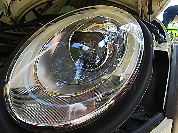 ジクロロメタン処理の透明度が高いので、UVカットクリアによるわずかな曇りでヘッドライトカバーが少し光っている。