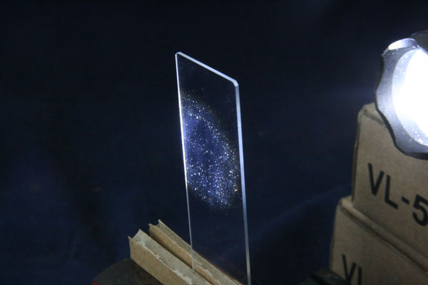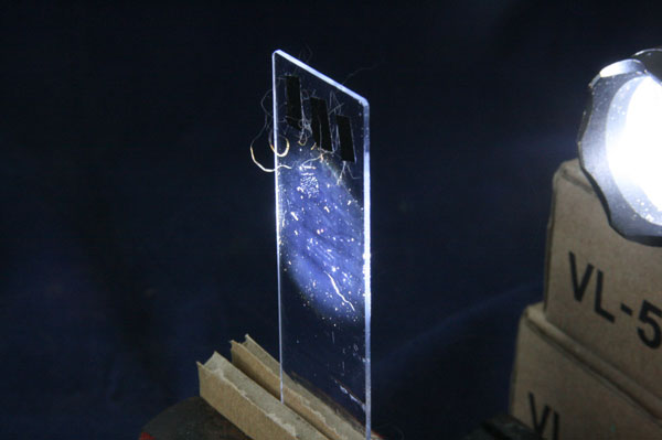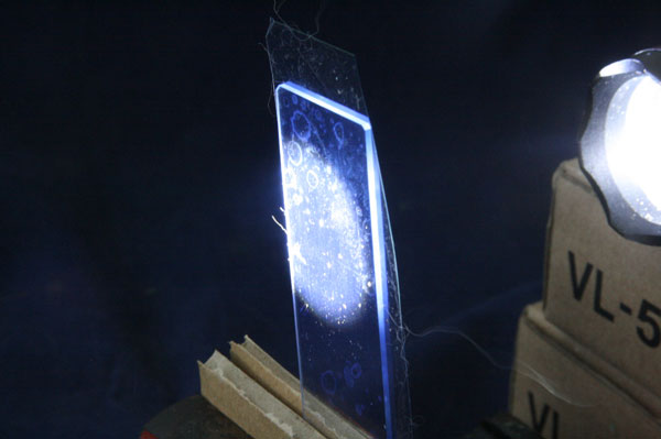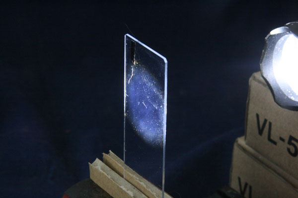 UVカットクリアをスライドグラスに塗り、懐中電灯で照らしてみた。