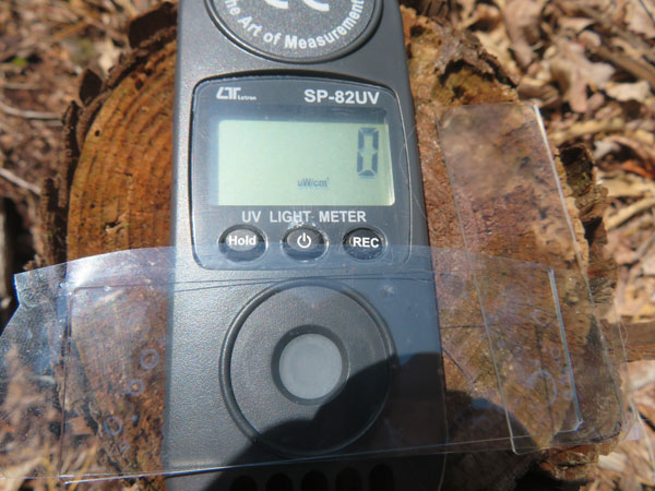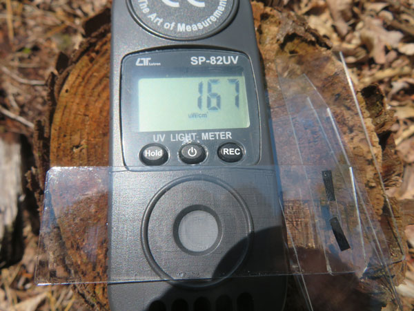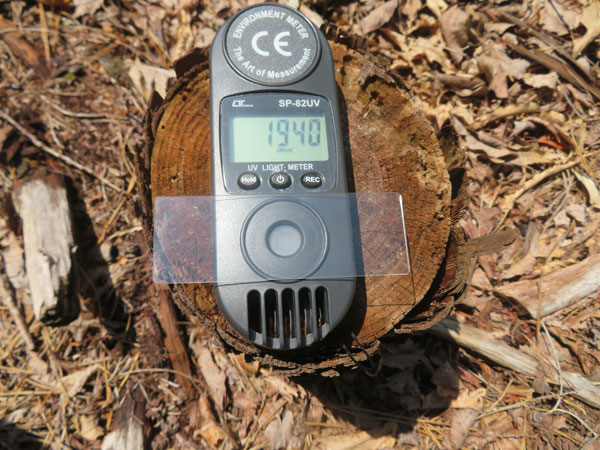 UVカットフィルムを貼ったスライドグラスの紫外線強度は0だった。