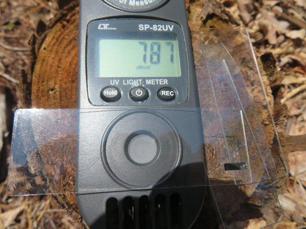 UVカットクリアの原液を1回塗ったスライドグラスを透過した紫外線量は787μW/cm2だった。