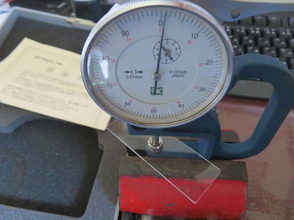 UVカットクリアを1回付で塗りし、十分に乾燥させた後の厚みは1.01mmなので、塗膜厚は12μm程度と言う事になる。