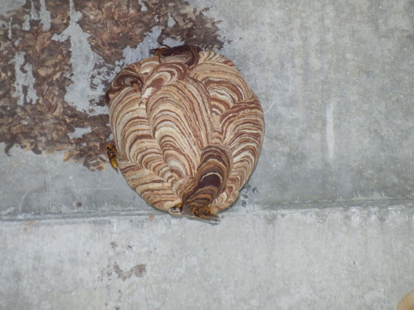 なんかハチが多いなと思って家の周りを点検すると、雨の当たらぬ部分に巣が作られている。