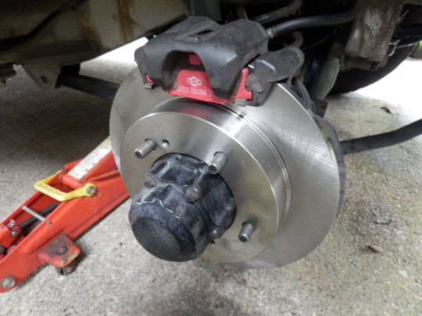 新品のロータを付け、キャリパを元通りに固定する。