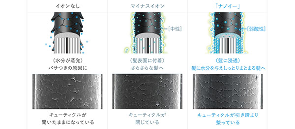 PanasonicによればマイナスイオンなりOHラジカルの効果は、髪表面の水分量とpHであるとしている。